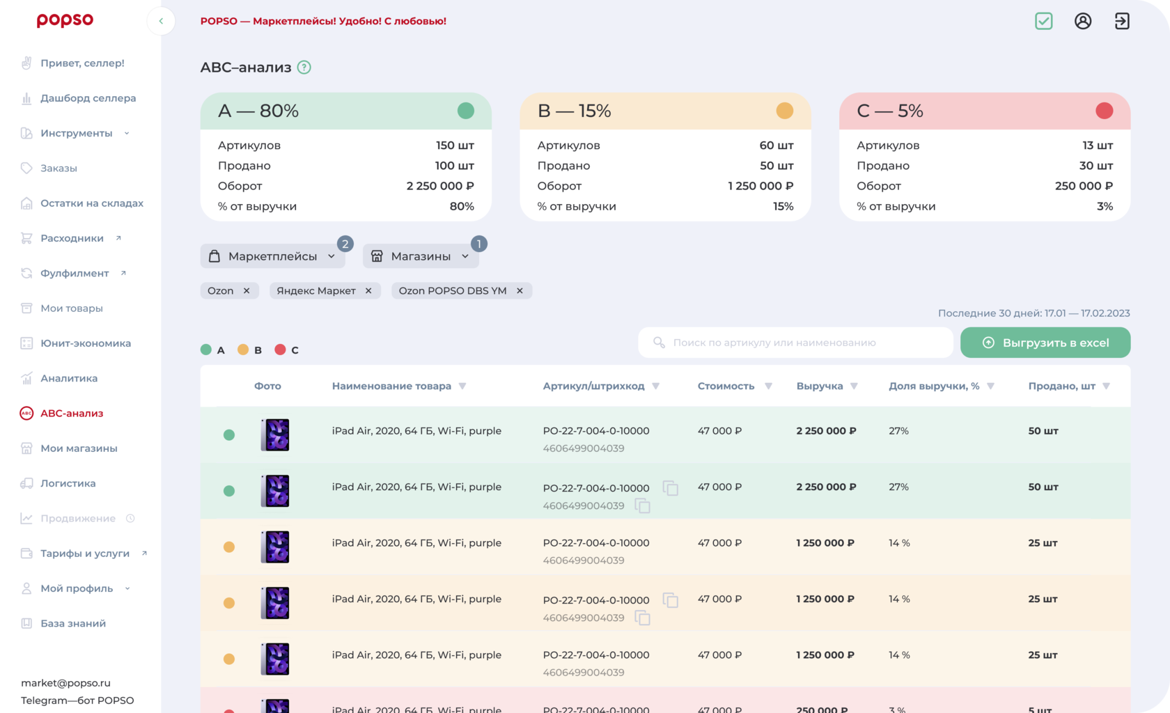 Возможность сортировать по наименованию, артикулу и штрихкоду